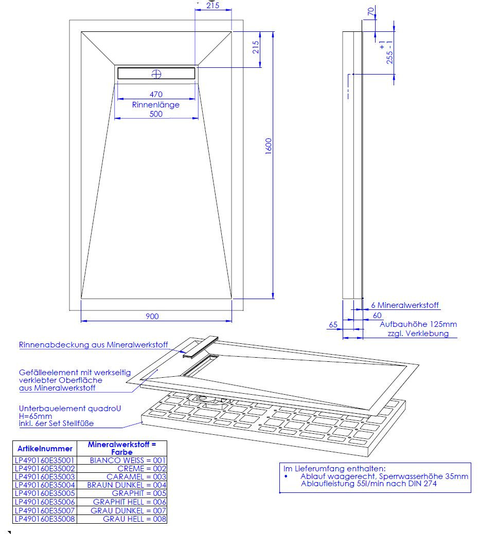 hochwertige Oberfläche aus 0,6 cm Mineralwerkstoff werkseitig aufgebracht auf Hartschaumelement mit eingearbeitetem Gefälle, Oberfläche rutschhemmend nach DIN 51097, Gruppe B, normgerecht abgedichtet nach DIN 18534-1, Wassereinwirkungsklasse W2-1, mit umlaufendem Vliesüberstand von 7 cm zur fachgerechten Abdichtung der Übergänge zur Wand bzw. zu den angrenzenden Bauteilen, integrierte, eingedichtete Rinne mit Bodenablauf, Sperrwasserhöhe 3,5 cm, System mit Unterbauelement quadroU zur Höhenanpassung auf der Baustelle, wahlweise 6,5 oder 8 cm hoch, Unterbau quadroU erweiterbarzum Schallschutz für erhöhte Anforderung, schneidbar, Gefälleelement mit werkseitig verklebter Oberfläche aus Mineralwerkstoff, Rinnenabdeckung aus Mineralwerkstoff, mit 6er Set Stellfüße und Montagekleber, Bodenablauf waagerecht