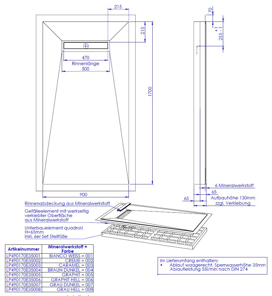 hochwertige Oberfläche aus 0,6 cm Mineralwerkstoff werkseitig aufgebracht auf Hartschaumelement mit eingearbeitetem Gefälle, Oberfläche rutschhemmend nach DIN 51097, Gruppe B, normgerecht abgedichtet nach DIN 18534-1, Wassereinwirkungsklasse W2-1, mit umlaufendem Vliesüberstand von 7 cm zur fachgerechten Abdichtung der Übergänge zur Wand bzw. zu den angrenzenden Bauteilen, integrierte, eingedichtete Rinne mit Bodenablauf, Sperrwasserhöhe 3,5 cm, System mit Unterbauelement quadroU zur Höhenanpassung auf der Baustelle, wahlweise 6,5 oder 8 cm hoch, Unterbau quadroU erweiterbarzum Schallschutz für erhöhte Anforderung, schneidbar, Gefälleelement mit werkseitig verklebter Oberfläche aus Mineralwerkstoff, Rinnenabdeckung aus Mineralwerkstoff, mit 6er Set Stellfüße und Montagekleber, Bodenablauf waagerecht