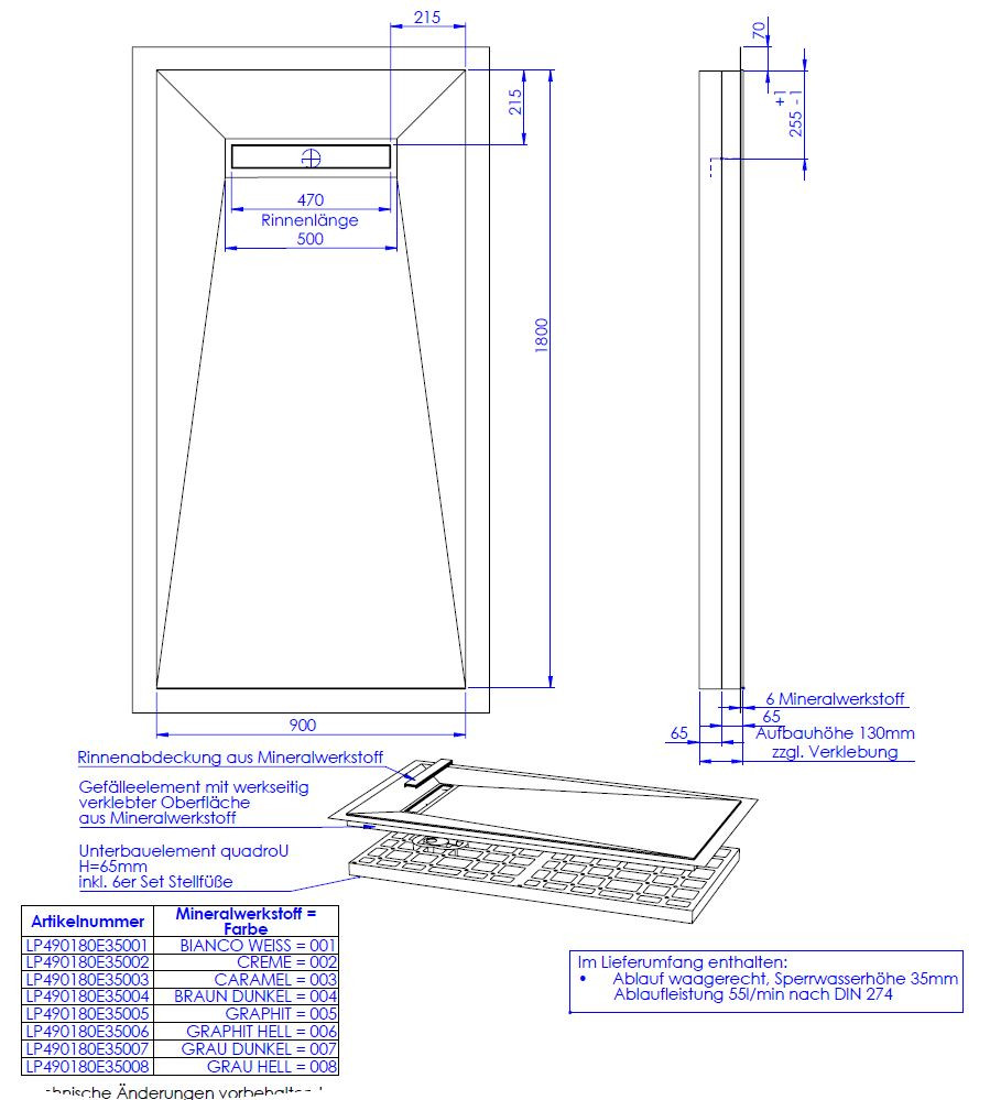 hochwertige Oberfläche aus 0,6 cm Mineralwerkstoff werkseitig aufgebracht auf Hartschaumelement mit eingearbeitetem Gefälle, Oberfläche rutschhemmend nach DIN 51097, Gruppe B, normgerecht abgedichtet nach DIN 18534-1, Wassereinwirkungsklasse W2-1, mit umlaufendem Vliesüberstand von 7 cm zur fachgerechten Abdichtung der Übergänge zur Wand bzw. zu den angrenzenden Bauteilen, integrierte, eingedichtete Rinne mit Bodenablauf, Sperrwasserhöhe 3,5 cm, System mit Unterbauelement quadroU zur Höhenanpassung auf der Baustelle, wahlweise 6,5 oder 8 cm hoch, Unterbau quadroU erweiterbarzum Schallschutz für erhöhte Anforderung, schneidbar, Gefälleelement mit werkseitig verklebter Oberfläche aus Mineralwerkstoff, Rinnenabdeckung aus Mineralwerkstoff, mit 6er Set Stellfüße und Montagekleber, Bodenablauf waagerecht