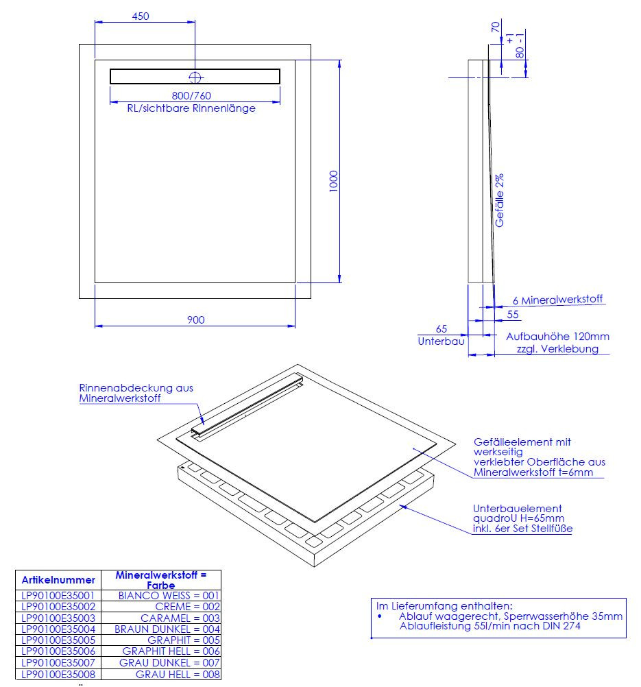 hochwertige Oberfläche aus 0,6 cm Mineralwerkstoff werkseitig aufgebracht auf Hartschaumelement mit eingearbeitetem Gefälle, Oberfläche rutschhemmend nach DIN 51097, Gruppe B, normgerecht abgedichtet nach DIN 18534-1, Wassereinwirkungsklasse W2-1, mit umlaufendem Vliesüberstand von 7 cm zur fachgerechten Abdichtung der Übergänge zur Wand bzw. zu den angrenzenden Bauteilen, integrierte, eingedichtete Rinne mit Bodenablauf, Sperrwasserhöhe 3,5 cm, System mit Unterbauelement quadroU zur Höhenanpassung auf der Baustelle, wahlweise 6,5 oder 8 cm hoch, Unterbau quadroU erweiterbarzum Schallschutz für erhöhte Anforderung, schneidbar, Gefälleelement mit werkseitig verklebter Oberfläche aus Mineralwerkstoff, Rinnenabdeckung aus Mineralwerkstoff, mit 6er Set Stellfüße und Montagekleber, Bodenablauf waagerecht