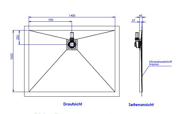 mit Oberfläche aus Mineralwerkstoff 0,6 cm, bodeneben, barrierefrei, rutschhemmend nach DIN 51097, Gruppe B, fugenlose Oberfläche, werkseitig aufgebracht auf Hartschaumelement, mit integriertem Gefälle, werkseitig aufgebrachte Vliesabdichtung mit Überstand 7 cm umlaufend gem. DIN 18534-1, Wassereinwirkungsklasse W2-I, Ablauf waagerecht DN 50, Ablaufleistung 27 l/min, quadratische Designabdeckung aus Mineralwerkstoff