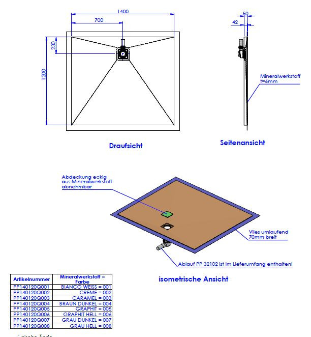 mit Oberfläche aus Mineralwerkstoff 0,6 cm, bodeneben, barrierefrei, rutschhemmend nach DIN 51097, Gruppe B, fugenlose Oberfläche, werkseitig aufgebracht auf Hartschaumelement, mit integriertem Gefälle, werkseitig aufgebrachte Vliesabdichtung mit Überstand 7 cm umlaufend gem. DIN 18534-1, Wassereinwirkungsklasse W2-I, Ablauf waagerecht DN 50, Ablaufleistung 27 l/min, quadratische Designabdeckung aus Mineralwerkstoff