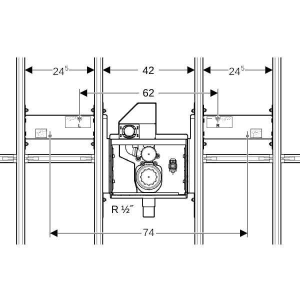 zum Einbau in GIS Tragsysteme für Vorwände, Trennwände oder freistehende Wände, für ONE Waschtische, für ONE Möbelwaschtische, für UP-Armaturen, Passend zu ONE, UP-Geruchsverschluss mit Serviceöffnung, Wandeinbaukasten mit Anschlussstutzen aus PE, Ø 50/56 mm, Elektroanschlussdose im UP-Gehäuse, mit 2 Konsolen, Bauschutze, 2 Gewindestangen M10, Kupplungsbuchse für Netzanschluss, Befestigungsmaterial