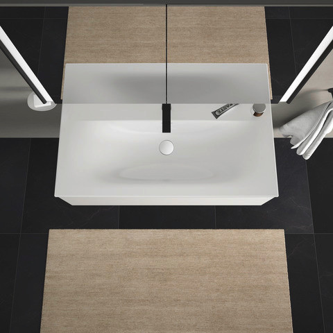 Unterseite glasiert, mit Push-Open Ventil mit keramischer Ventilabdeckhaube, zur Befestigung von Waschtischen ab der Größe 100 cm werden zwei Befestigungen Artikel Nr. 6951000000 benötigt, 234410 und 234412 Raumsparsiphon wird empfohlen in Verbindung mit Waschtischunterbau