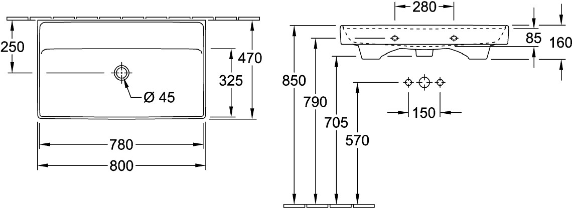 V&B Schrankwaschtisch Collaro 80 x 47 cm, ohne Überlauf, ohne Hahnloch, weiß