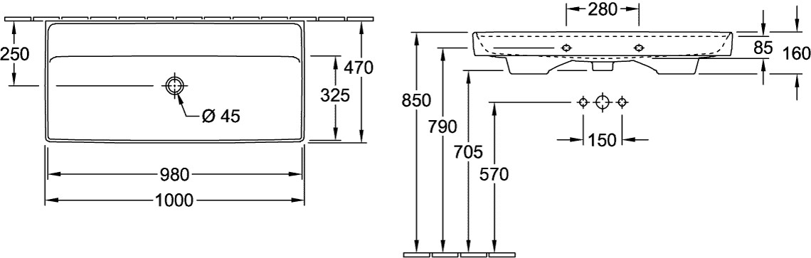 V&B Schrankwaschtisch Collaro 100 x 47 cm, ohne Überlauf, ohne Hahnloch, weiß K20562497