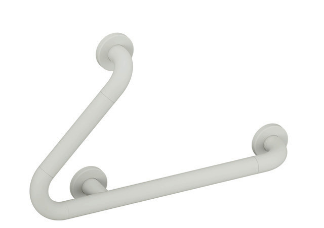 nicht für Einhängesitze vorgesehen, mit durchgehendem, korrosionsgeschütztem Stahlkern, links- und rechtsseitig montierbar, Montage an der Wand mit Befestigungsmaterial, Achsmaße 370 mm, 316 mm und 255 mm, Winkel 45°, 88 mm tief, Stangen ø 33 mm, Rosetten ø 70 mm, aus Polyamid