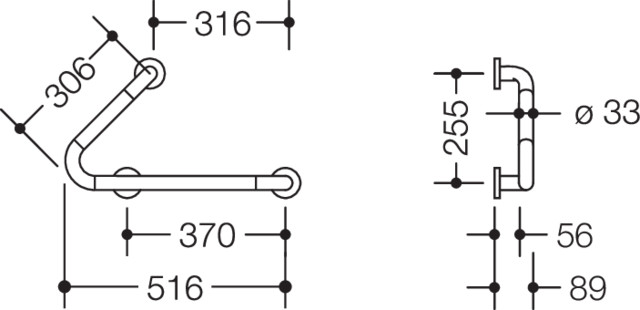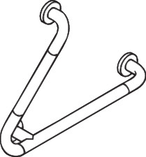 nicht für Einhängesitze vorgesehen, mit durchgehendem, korrosionsgeschütztem Stahlkern, links- und rechtsseitig montierbar, Montage an der Wand mit Befestigungsmaterial, Achsmaße 370 mm, 316 mm und 255 mm, Winkel 45°, 88 mm tief, Stangen ø 33 mm, Rosetten ø 70 mm, aus Polyamid