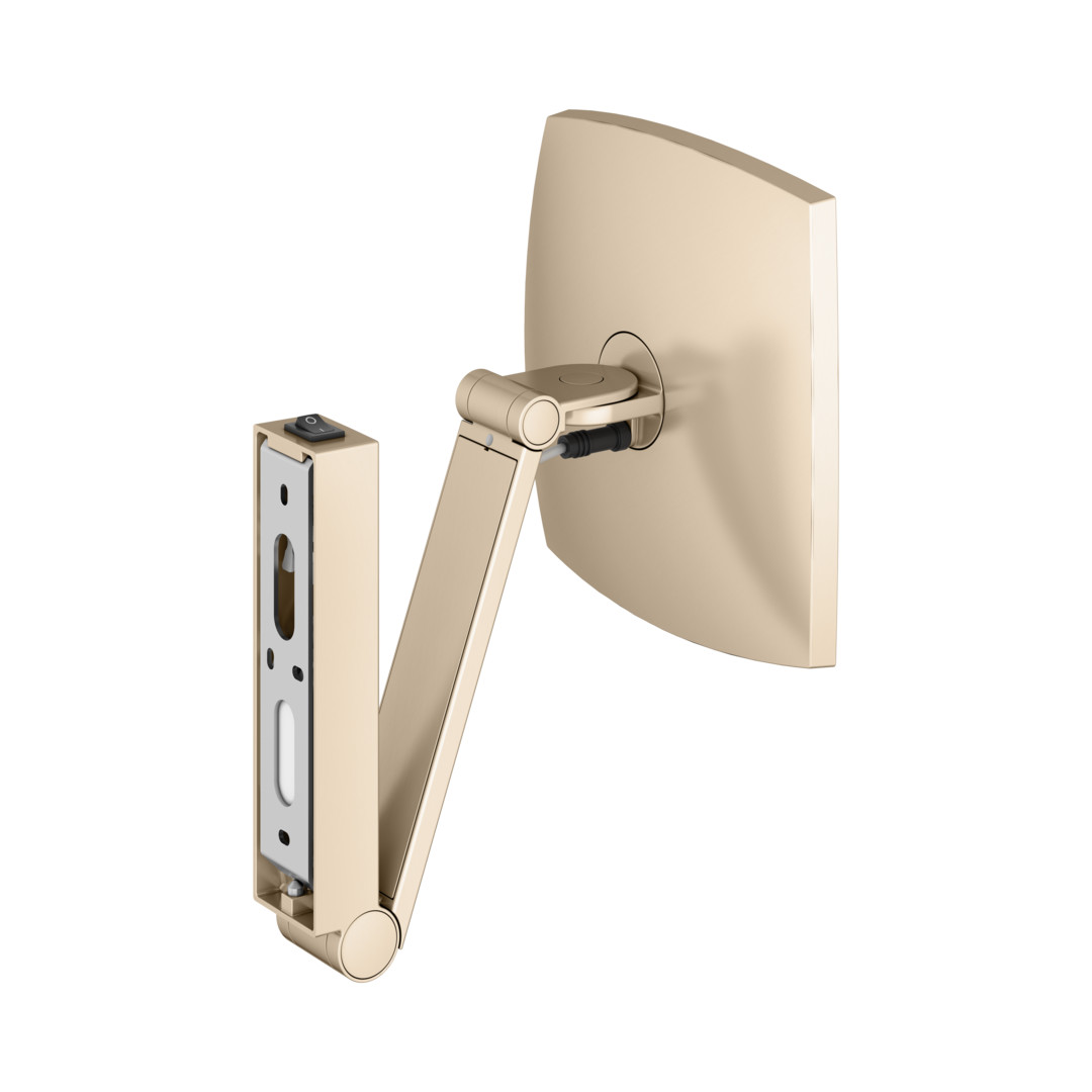 Wandmodell, eckig, IP24, stufenlos einstellbar von 2700 Kelvin (warmweiß) bis 6500 Kelvin (Tageslicht), mit UP-Kabelführung, an dreidimensional verstellbarem Schwenkarm, Spiegel einseitig, Vergrößerungsfaktor x 5, Bedienung über Glasbedienfeld mit kapazitiver Touch-Sensorik und LED-Anzeige, Stromversorgung: Netzanschluss über Wandanschlussdose, 12 V Unterputz-Netzteil, Eingangsbereich 220~240 V, Unterputz-Netzteil und Niedervolt-Verbindungskabel im Lieferumfang enthalten, Beleuchtung: LED 7 Watt