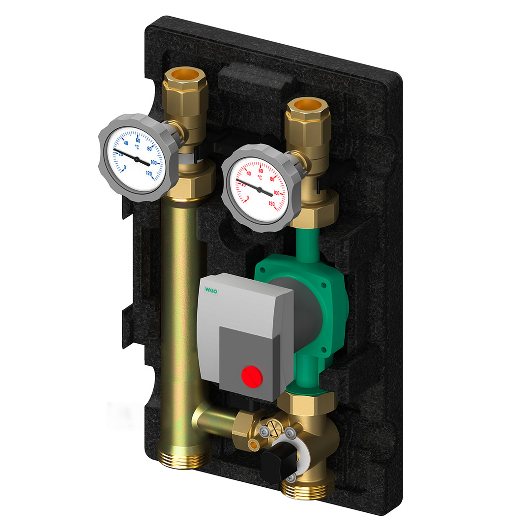 gemischter Heizkreis für Verteiler bis 70 kW bzw. Wandmontage geeignet, mit oder ohne Umwälzpumpe EL 180 mm mit Anschlusskabel, 2 Kugelhähne rücklaufseitig mit handaufstellbarer Schwerkraftbremse, 2 im Kugelhahngriff integrierte Kontaktthermometer Anzeigebereich 0-120 °C, 3-Wege-T-Mischer mit stufenlos einstellbarem Bypass, EPP-Isolierung unterer Abgang 1" IG, flachdichtend, oberer Abgang mit Innengewinde entsprechend Pumpendimension, Wandhalterung