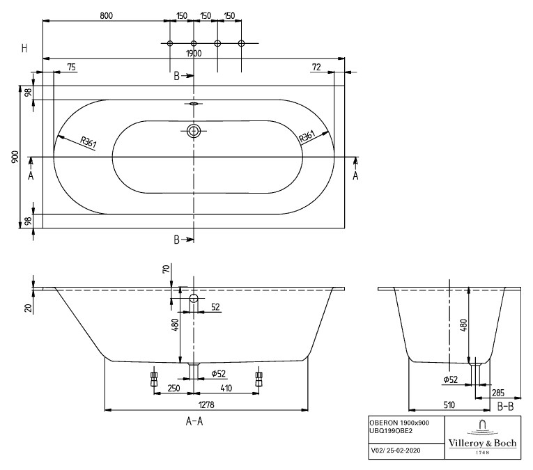 V&B Rechteck-Badewanne Oberon 190x90cm, Ablauf mittig, Quaryl, weiß K20738722