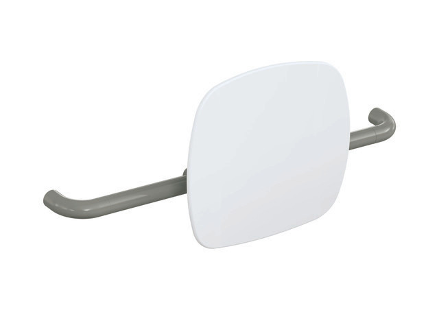 beidseitig angebrachte, rechtwinklig gebogene Befestigungsstangen, mit durchgehendem, korrosionsgeschütztem Stahlkern, Montage an Stützklapp-/Wandstützgriffen mit Wandplatte Serie 801, Achsmaß von 650-750 mm bauseits verstellbar, 150 mm tief, Stangen 33 mm, Lehne 370 x 334 mm, erfüllt die Anforderungen nach DIN 18040 und ÖNORM B 1600/1601