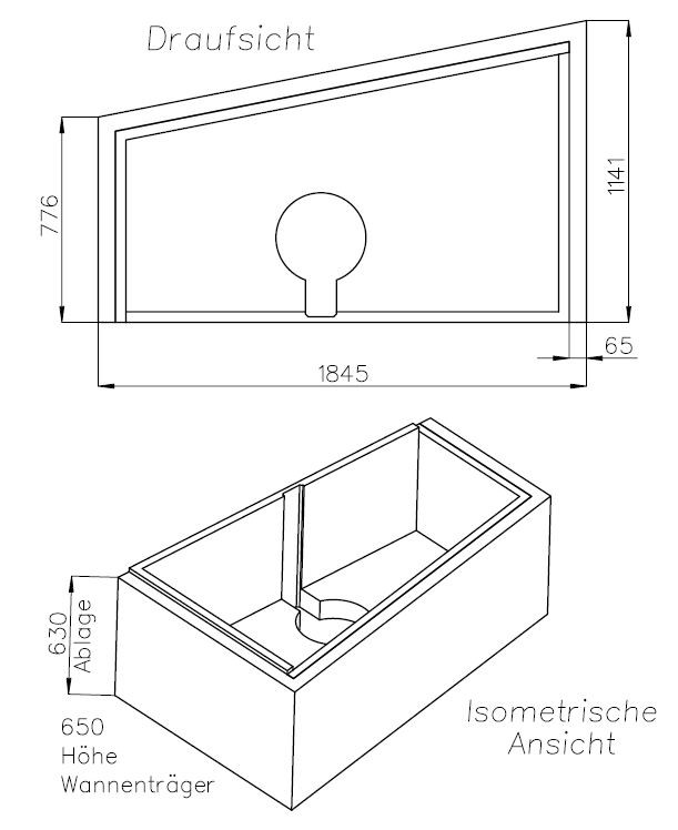 Schedel Wannenträger Hoesch Thasos Trapez 175 x 110 cm, links, 5-Eck, mit Ablage, Höhe 65cm