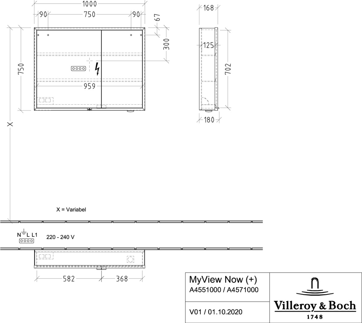 V&B Spiegelschrank MY VIEW NOW 100 x 75 x 16,8 cm, LED-Beleuchtung, 2 Türen, mit Sensorschalter