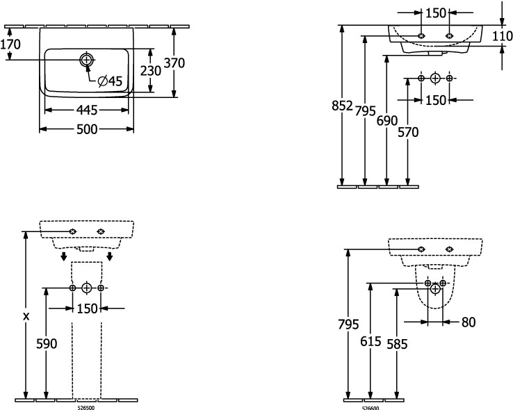 V&B Handwaschbecken O.NOVO 50x37cm, eckig, mit Hahnloch, ohne Überlauf, weiß C-plus K20563448