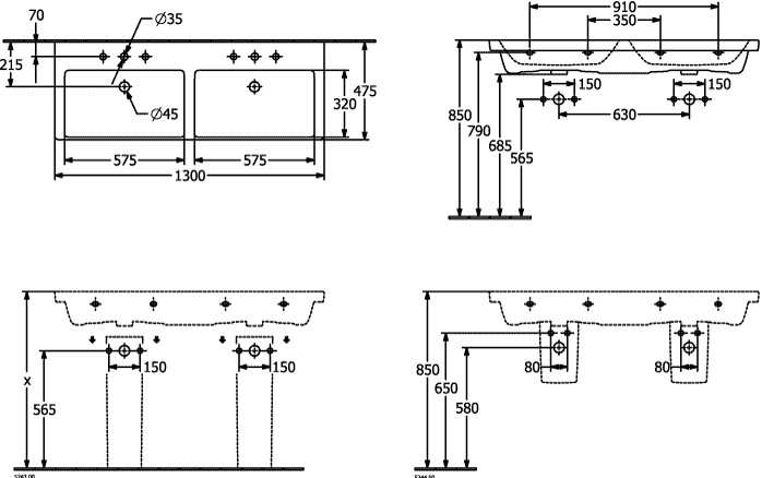 V&B Schrank-Doppelwaschtisch Subway 3.0 130x47cm, eckig, mit je 1 Hahnloch/ohne Überlauf, weiß C-plus K20563121