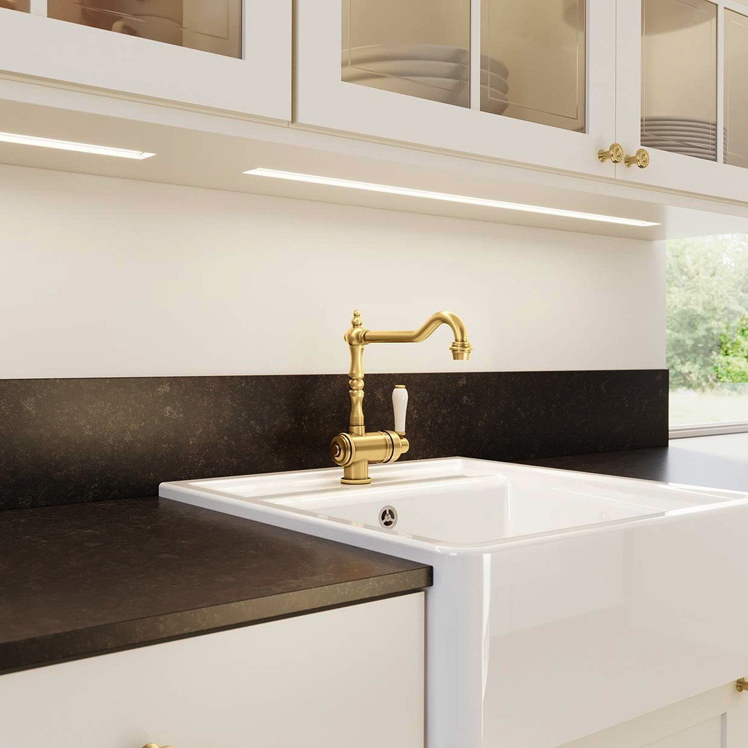 passend zum Landhausstil, 13,7 l/ min bei 3 bar Druck, Auslauf 360° schwenkbar, Armaturenbohrung Ø 35 mm erforderlich, mit Keramik-Scheibenkartusche, patentierter Strahlregler, flexible Anschlussrohre mit 700 mm Länge und 3/8" Mutter, Stabilisierungsplatte, mit Rückflussverhinderer nach DIN EN 1717