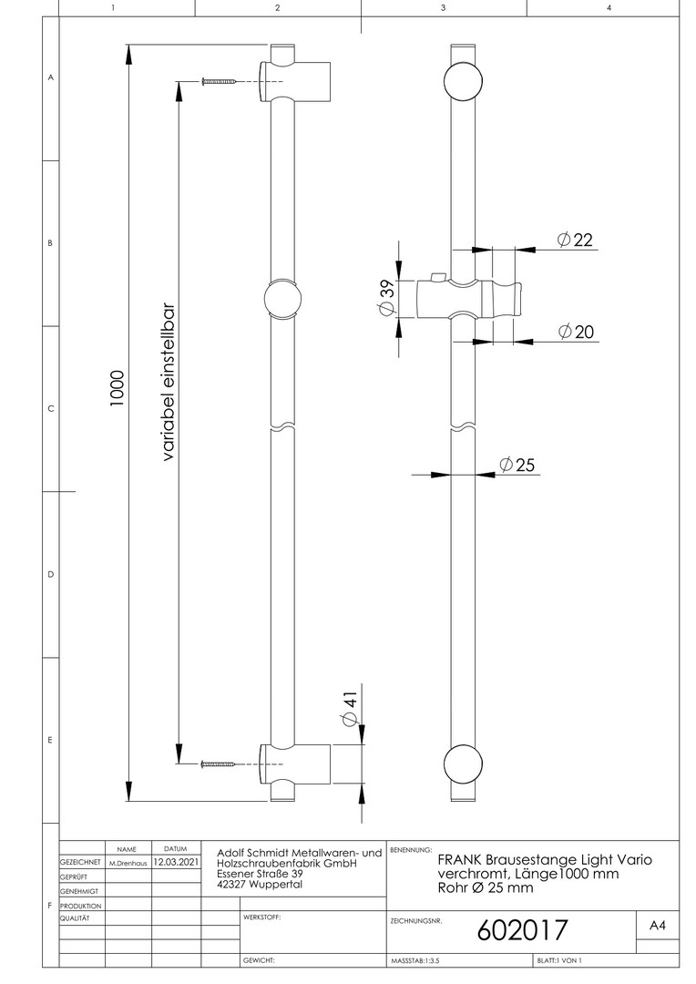 FRANK Brausestange Duo-Vario 1000 mm, Rohr d= 25mm, Konusgleiter, verchromt
