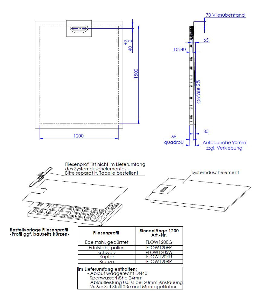 Systemduschelement für die lineare Entwässerung auf der Belagsebene, Gefälleelement mit werkseitig eingearbeitetem Gefälle von ca. 2 %, werkseitig aufgebrachte Vliesabdichtung nach DIN 18534-1, Wassereinwirkungsklasse W2-I, integriertes Ablaufgehäuse aus ABS mit Geruchsverschluss, Ablaufstutzen DN 40 Richtung Raumseite zum einfachen Anschluss an die HT-Entwässerung, mit zweiter Ablaufebene, Sekundärentwässerung, Sperrwasserhöhe 24 mm, Ablaufleistung 0,5 l/s bei 20 mm Anstauung, Unterbauelement quadroU zum Höhenausgleich auf der Baustelle, mit 6er Set Stellfüße und Montagekleber