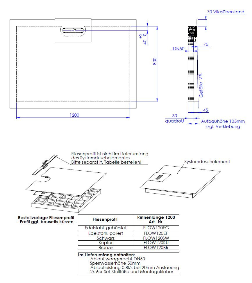 Systemduschelement für die lineare Entwässerung auf der Belagsebene, Gefälleelement mit werkseitig eingearbeitetem Gefälle von ca. 2 %, werkseitig aufgebrachte Vliesabdichtung nach DIN 18534-1, Wassereinwirkungsklasse W2-I, integriertes Ablaufgehäuse aus ABS mit Geruchsverschluss, Ablaufstutzen DN 50 Richtung Raumseite zum einfachen Anschluss an die HT-Entwässerung, mit zweiter Ablaufebene, Sekundärentwässerung, Sperrwasserhöhe 50 mm, Ablaufleistung 0,8 l/s bei 20 mm Anstauung, Unterbauelement quadroU zum Höhenausgleich auf der Baustelle, mit 6er Set Stellfüße und Montagekleber