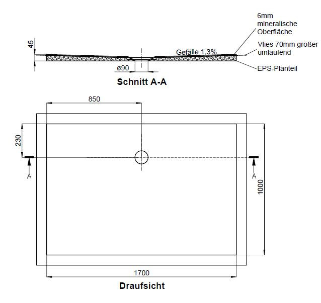 mit Oberfläche aus Mineralwerkstoff 0,6 cm, bodeneben, barrierefrei, rutschhemmend nach DIN 51097, Gruppe B, fugenlose Oberfläche, werkseitig aufgebracht auf Hartschaumelement, mit integriertem Gefälle, werkseitig aufgebrachte Vliesabdichtung mit Überstand 7 cm umlaufend gem. DIN 18534-1, Wassereinwirkungsklasse W2-I, passend für alle Abläufe 9 cm