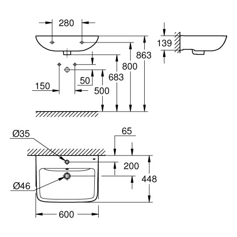 GROHE Waschtisch BauEdge Keramik 60 x 44,8 cm, 1 Hahnloch, mit Überlauf, wandhängend, alpinweiß
