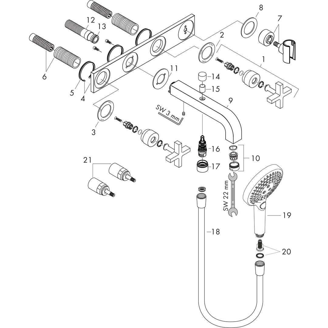 mit Platte, für Wandmontage, bestehend aus 3-Loch-Wannenarmatur, Handbrause, Brausehalter, Brauseschlauch, 2 Verbraucher, Ausladung 222 mm, Anschlussart Grundkörper, Strahlart Armatur Normalstrahl, Strahlart Handbrause Rain, RainAir, WhirlAir, max. Durchflussmenge bei 3 bar 22,5 l/min, Durchfluss für Wanneneinlauf bei 3 bar 22,5 l/min, Durchfluss für Handbrause bei 3 bar 20 l/min, Mindestfließdruck 1 bar, Betriebsdruck min. 1/max. 10 bar, Umsteller mit automatischer Rückstellung, Rückflussverhinderer, Anschlussgröße DN 15, AirPower Technologie, Quick Clean Antikalksystem