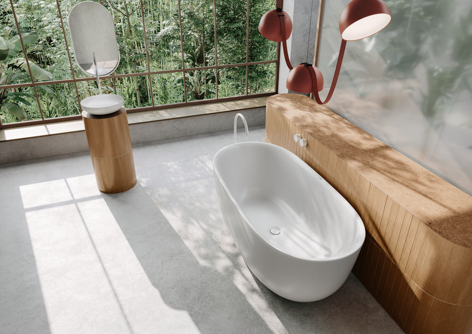 freistehende Badewanne komplett aus Stahl-Emaille gefertigt mit mittig positioniertem Kunststoffablaufdeckel, Ablaufloch Ø 52 mm, bestehend aus: klick-klack Kunststoffablauf und Badewannen-Antidröhn-Set
