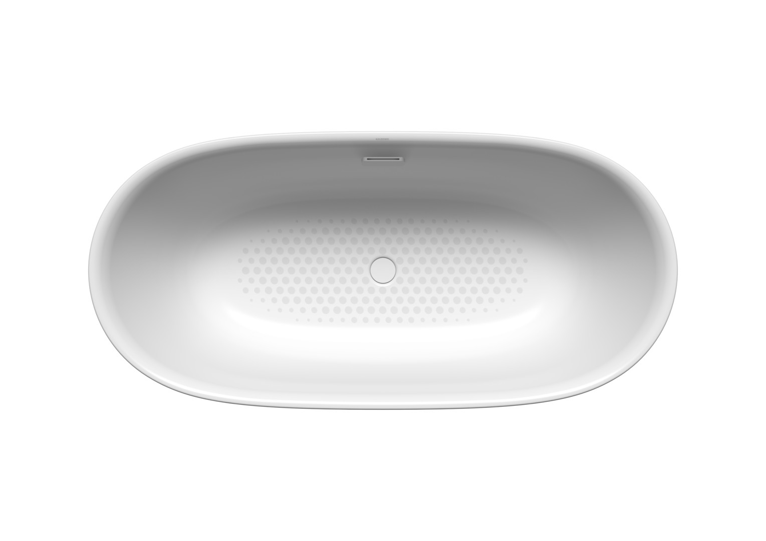 freistehende Badewanne komplett aus Stahl-Emaille gefertigt mit mittig positioniertem Kunststoffablaufdeckel, Ablaufloch Ø 52 mm, bestehend aus: klick-klack Kunststoffablauf und Design-Überlauf und Badewannen-Antidröhn-Set