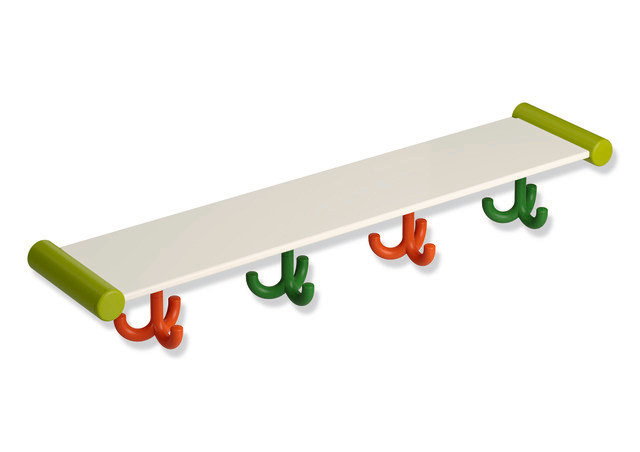 Halter und Haken aus Polyamid, Bestückung der farbigen Haken erfolgt aus Sichtrichtung des Nutzers von links nach rechts, Trägerplatte aus HPL, Oberfläche weiß, seidig glänzend mit leichter Struktur, Abstand zwischen den Plätzen von 150 mm, nachrüstbar, entspricht den Vorgaben der DGUV-Richtlinie 82 "Kindertageseinrichtungen", max. statische Belastung 20 kg, 630 (Achsmaß 600 mm) x 89 x 132 mm