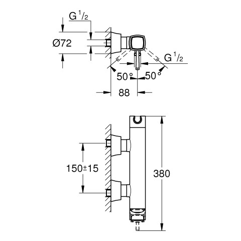 Wandmontage, SilkMove 46 mm Keramikkartusche, Long-Life Oberfläche, variabel einstellbare Mengenbegrenzung, integrierter Handbrausehalter, Brauseabgang unten 1/2", integrierter Rückflussverhinderer, verdeckte S-Anschlüsse, eigensicher gegen Rückfließen