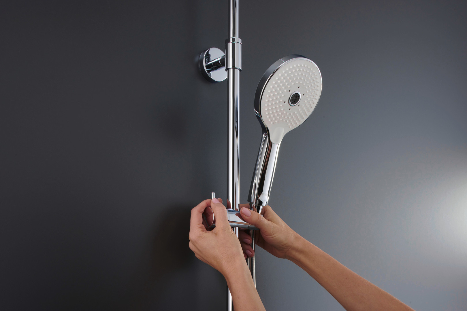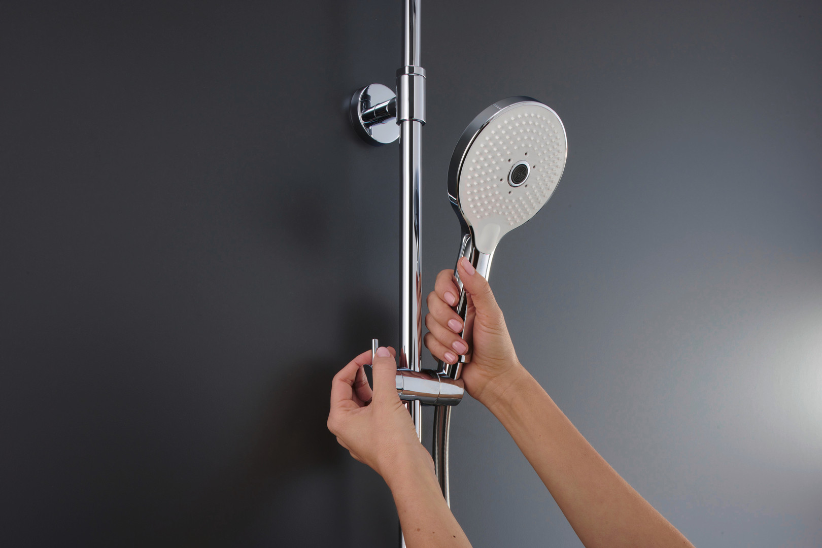 Thermostatkartusche, Sicherheitssperre (38 °C), Kopfbrause Rain, Handbrause Rain/Pulse/Mono, Durchmesser Kopfbrause 230 mm, Wasseranschluss DN 15, Schlauchanschluss 1/2", Durchflussmenge Handbrause 10,5 l/min bei 3 bar, Durchflussmenge Kopfbrause 14 l/min bei 3 bar, Kopfbrause im Winkel verstellbar, Handbrausenhalterung höhenverstellbar, mit Rückflussverhinderer, Höhe 940 mm
