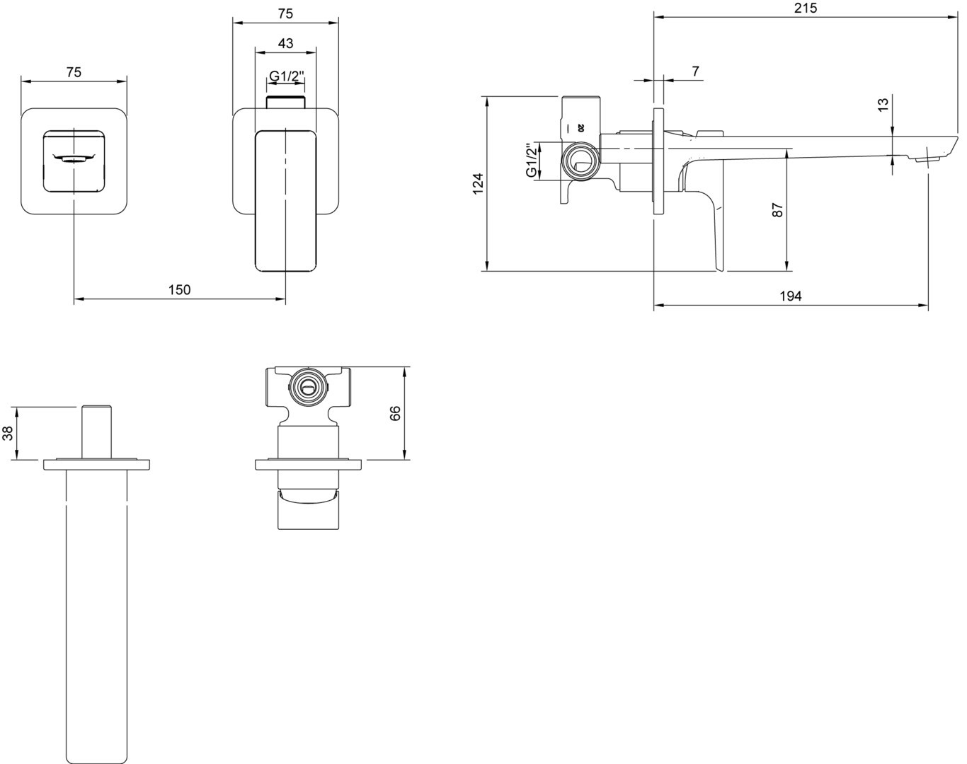225 x 115 x 215 mm, Eckig, Material aus Messing, mit Einbaukörper, Anschlusstyp 1/2'', mit verstellbarem Strahlregler, maximale Durchflussmenge bei 3 bar 3,8 l/min, Auslauflänge 194 mm