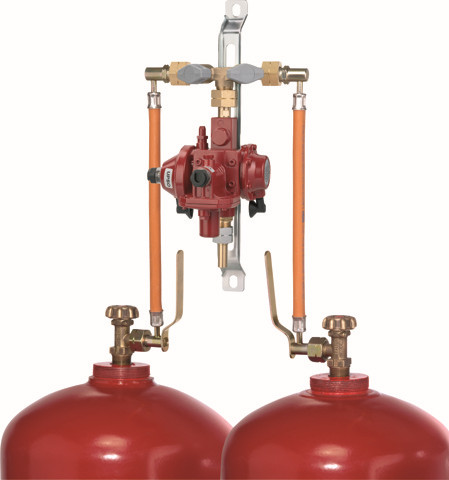 zum Anschluss an Gasflaschen mit 33 kg Füllgewicht, zur Druckregelung auf den Nenndruck des Gasgerätes bestehend aus: Hochdruck-Schlauchleitungen mit Großflaschenanschluss, Rohrstücken, manueller Umschalteinrichtung, Niederdruckregler mit Überdruck-Sicherheitsabsperreinrichtung OPSO (SAV), mit Unterdruck-Sicherheitsabsperreinrichtung UPSO, Sicherheitsabblaseventil PRV, Verschraubungsteilen und Halteschiene, höchste Sicherheitsstufe Safety level 5, bei der nicht nur ein für die angeschlossenen Verbrauchsgeräte zu hoher Druck überwacht wird, sondern auch ein zu niedriger Druck bzw. eine Leckage in der angeschlossenen Rohrleitung, dabei wird zusätzlich zur Überdruck-Sicherheitseinrichtung OPSO (SAV) / Sicherheitsabblaseventil PRV eine Unterdruck-Sicherheitsabsperreinrichtung UPSO für zu niedrigen Druck verwendet, Vorteile und Ausstattung, ein Flaschenwechsel ist ohne Betriebsunterbrechung möglich, Ausführung Zweiflaschenanlage mit Übergangsstück RST 12 mm, Ausführung Vierflaschenanlage mit Übergangsstück RST 12 mm, Einzelarmaturen mit DIN-DVGW- bzw. DVGW-Baumusterprüfzertifikat oder EU-Baumusterprüfbescheinigung GGV, Einzelarmaturen mit DIN-DVGW- bzw. DVGW-Baumusterprüfzertifikat oder EU-Baumusterprüfbescheinigung DGR, maximal zulässiger Druck: PS 16 bar, entspricht den berufsgenossenschaftlichen Anforderungen der DGUV-Regel 110-010 (Deutsche Gesetzliche Unfallversicherung - bisher DGUV Vorschrift 79)