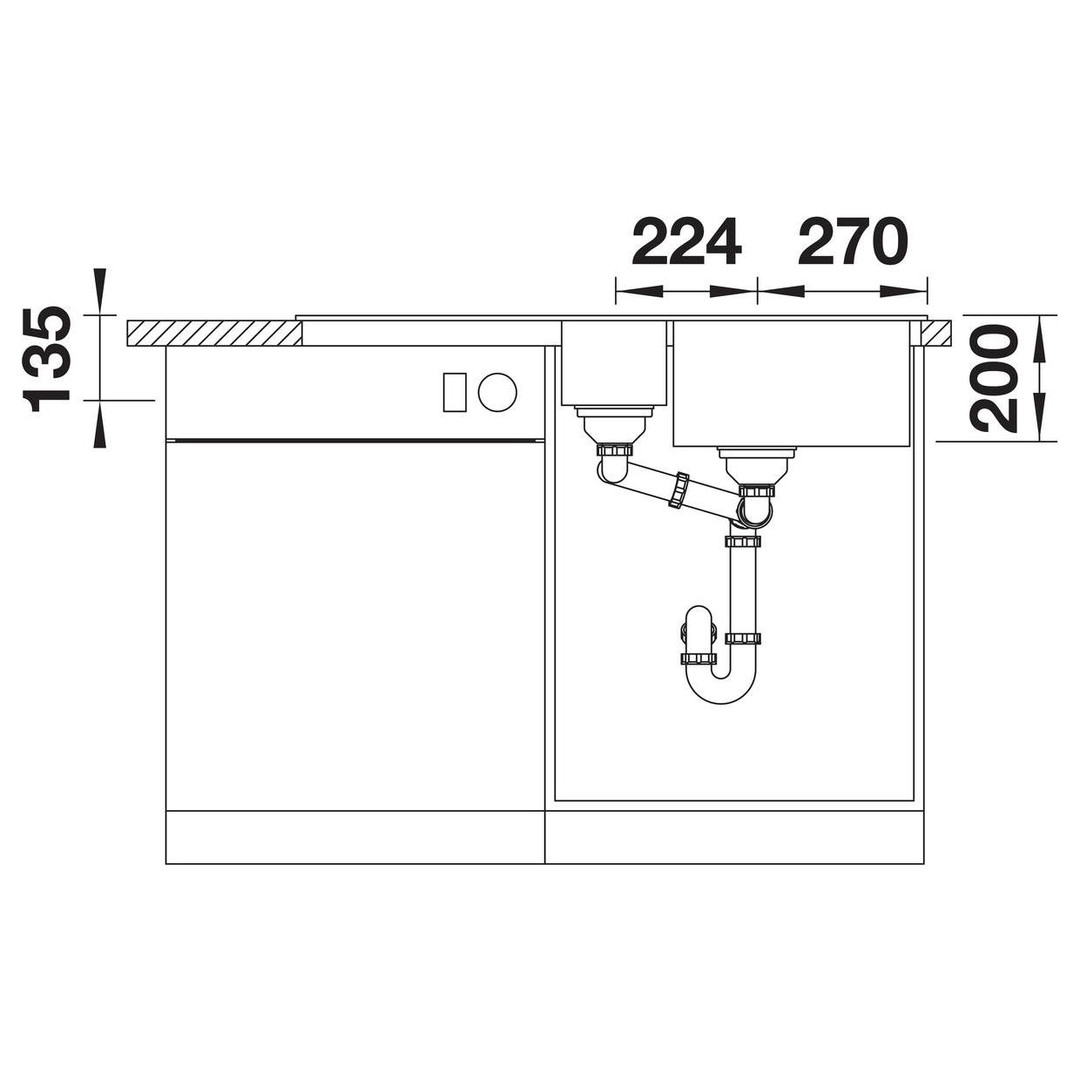 Beckentiefe 20/13,5 cm, XL-Becken in Kombination mit Ablauf und ebener Abtropffläche, mit multifunktionale ADIRA-Klappmatte, Multifunktionsschale aus Kunststoff, Ablaufgarnitur mit Raumsparrohr, 2x 3 1/2“ InFino-Korbventil mit integrierter Ablauffernbedienung (Drehknopf) für das Hauptbecken, Einbau von oben, Untermaß 60 cm