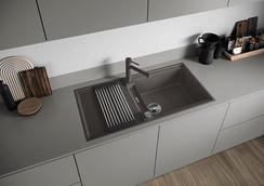 Beckentiefe 20 cm, XL-Becken in Kombination mit Ablauf und ebener Abtropffläche, mit mulitfunktionale ADIRA-Klappmatte (kann als Aufsatz auf dem Becken oder als Abtropffläche verwendet werden), Ablaufgarnitur mit Raumsparrohr, 2x 3 1/2“ InFino-Korbventil mit integrierter Ablauffernbedienung (Drehknopf), reversibel einbaubar, unterbündiger Einbei, flächenbündiger Einbau, Untermaß 60 cm