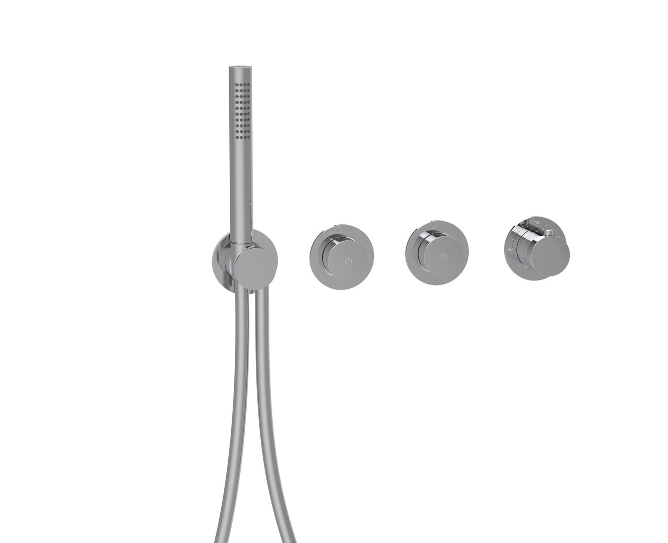 LOGIC-Thermostatkartusche, Heißwassersperre 38°C, Start + Stop des Wasserflusses durch drücken des PUSH Mengenventils, stufenlose Mengenregulierung, MODUL7 Brauseschlauch 150 cm mit Drehkonus, eigensicher gegen Rückfließen, bestehend aus Thermostat, 2x PUSH Mengenventil, Brausehalterset, Ausführung chrom/PVD Gold/schwarz matt mit Messing Stabhandbrause, Messing Bediengriffen und Messing Modulblenden Ø 70 mm, Ausführung Edelstahl mit Edelstahl Stabhandbrause, Edelstahl Bediengriffen und Edelstahl Modulblenden Ø 70 mm