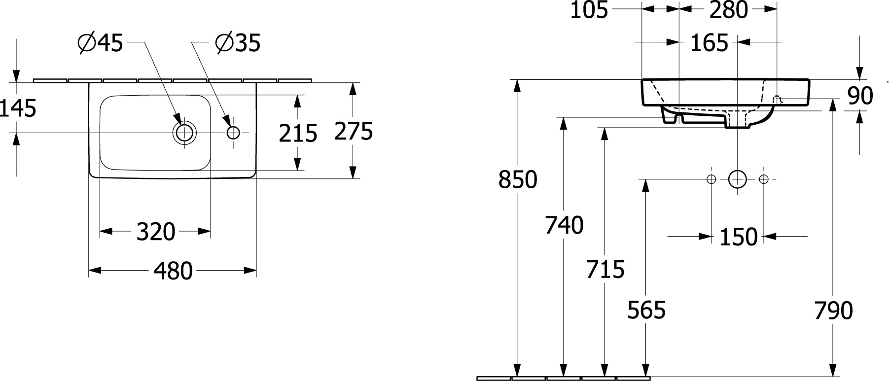 V&B Handwaschbecken Architectura 48x27,5cm, Becken links, 1 Hahnloch, ohne Überlauf, weiß