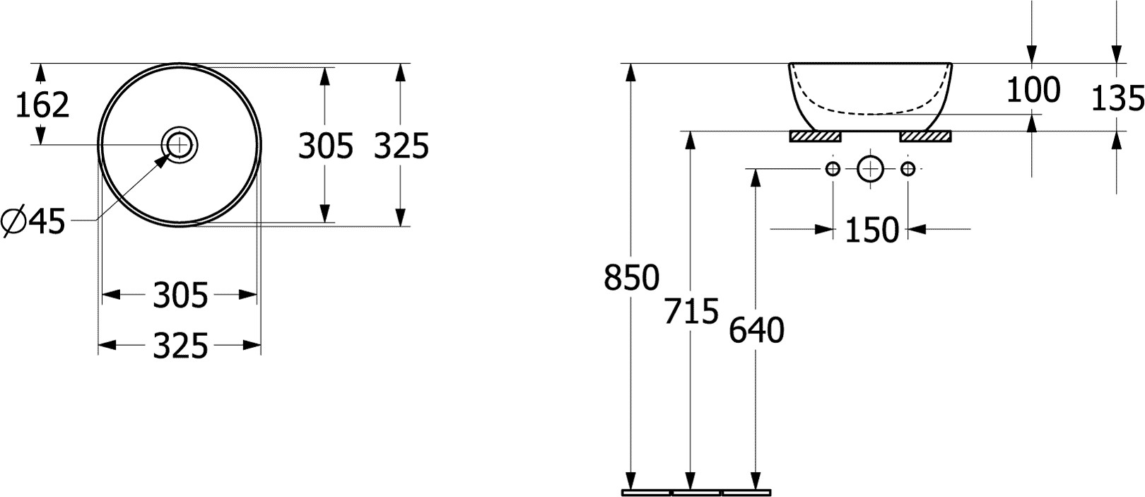 für Wandauslauf-Armatur oder Armatur mit erhöhtem Standfuß, ohne Hahnlochbank, ohne Überlauf, bestehend aus: 1 x Aufsatzwaschbecken, 1 x Befestigungssatz, 1 x Ausschnittschablone