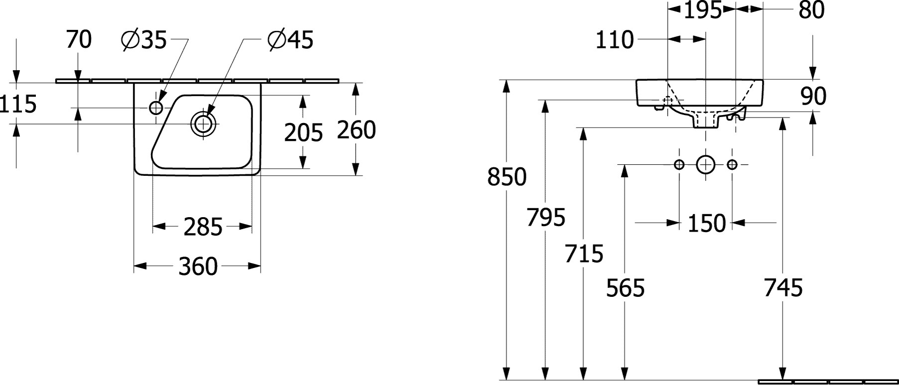 V&B Handwaschbecken Architectura 36x26cm, Becken rechts, 1 Hahnloch, ohne Überlauf, weiß K23249080