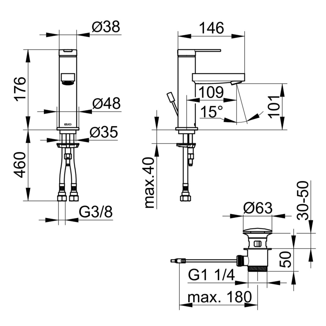 Auslaufhöhe 101 mm, Einlochmontage mit Schnell-Montage-System, Anschlussart Anschlussschläuche G 3/8, Mischwasserkartusche mit keramischen Dichtscheiben, mit Temperaturbegrenzung, Strahlregler M 24 x 1, Strahlwinkeln+/-6° verstellbar, Durchflussmenge begrenzt auf 7,6 l/min, für Durchlauferhitzer geeignet, geräuschgeprüft