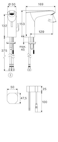 9 VDC, 100 - 240 VAC, 50 - 60 Hz, berührungslose, sensorgesteuerte Armatur mit innovativer ToF-Technologie, unempfindlich gegenüber reflektierenden Materialien wie z.B. Spiegeln, Warnwesten etc., mit integrierter Bluetooth-Schnittstelle,parametrierbar über SCHELL App, geeignet zur Vernetzung mit SCHELL Wassermanagement-System SWS, Einstellmöglichkeiten über SCHELL App, Parametrierung über voreingestellte Betriebsmodi (Strom sparen / Wasser sparen / Komfort), iIndividuelle Einstellungen im Expertenmodus (Sensor-Reichweite, Sensor-Messintervall, Personenerkennung, max. Laufzeit, Nachlaufzeit), Stagnationsspülung (Aus / im Intervall / Bedarfsgerechtes Spülen unter Berücksichtigung der Nutzungen / zu festen Terminen (Tag(e), Uhrzeit), Dauerspülung für thermische Desinfektion, Auslösung per App (3 - 10 min), Dauerfluss, Auslösung per App (15 - 600 s), Reinigungsstopp, Auslösung per App oder Nahreflex (Aus / 60 – 360 s), Durchfluss max. 5 l/min druckunabhängig, Fließdruck 1,0 - 5,0 bar, max. Ruhedruck 8 bar, max. Betriebstemperatur 70 °C (80 °C für thermische Desinfektion), Werkstoff Gehäuse Messing, Oberfläche chrom, Anschluss 2x G 3/8 IG, bestehend aus Time-of-Flight-Sensor-Einlocharmatur, Temperaturregler, Time-of-Flight-Sensor-Elektronik (ToF) mit automatischer Justierung des Sensorbereichs, Axialmagnetventil 6 V mit Vorfilter, versenkter Strahlregler (diebstahlgeschützt), Anschlusskabel 220 mm, mit Steckverbinder 3-polig, Schutzklasse IP 65, 2 flexible Anschlussschläuche Clean-Fix S G 3/8 IG x 410 mm, mit integriertem Rückflussverhinderer (RV, EN 1717: EB) und Vorfilter, Befestigungsmaterial für Waschtischmontage