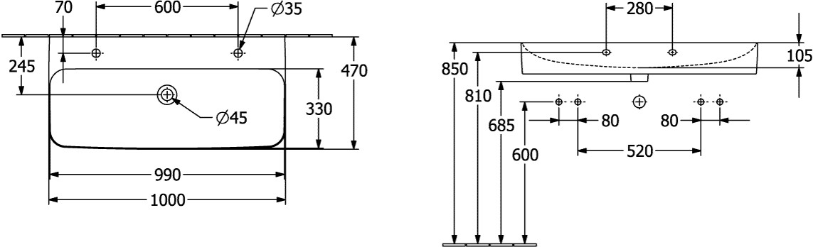 V&B Waschtisch Finion 100x47cm, 2 Hahnlöcher, ohne Überlauf, pure black C+