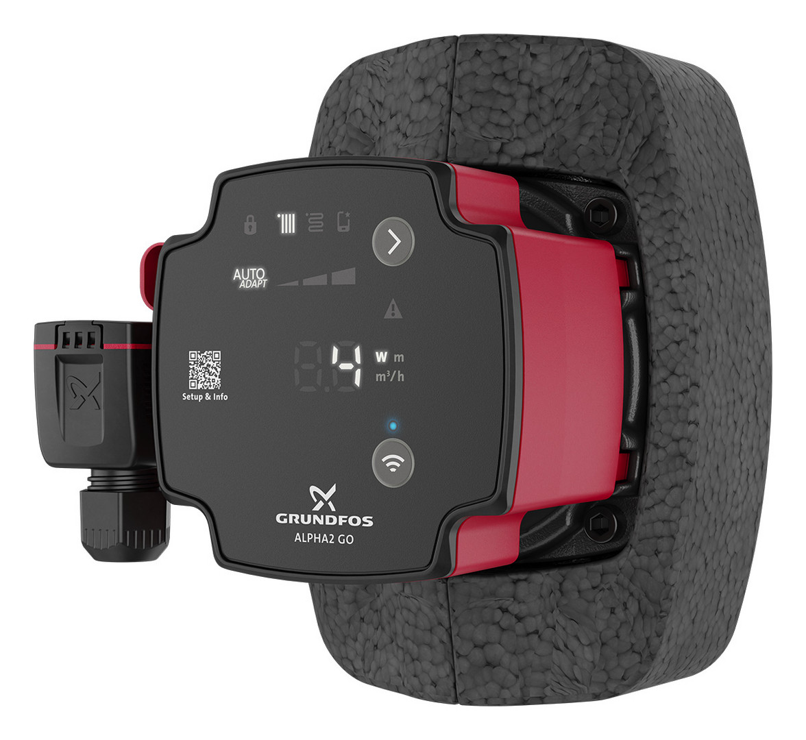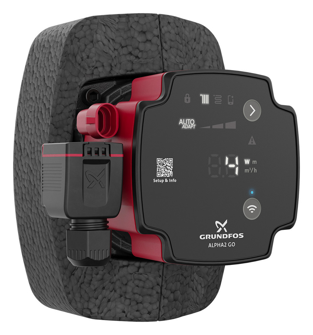 für Heizungs- und Klimaanlagen, über integrierte Bluetooth-Schnittstelle lässt sich eine Verbindung zur App Grundfos GO herstellen, Anschluss Zulauf G, Betriebsdruck max. 10 bar, Versorgungsspannung 1 x 230 V +- 10 %, 50/60 Hz, PE, Schutzart IPX4D, Pumpengehäuse Grauguss, mit Alpha-Kabelklemmstecker, Wärmedämmschale und Dichtungen (ohne Verschraubungssatz)