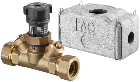 voreinstellbar, Gewinde, entzinkungsbeständiges Messing, mit stufenloser Voreinstellung, mit beiderseits montierten Mess- und Entleerungsventil sowie Isolierschalen