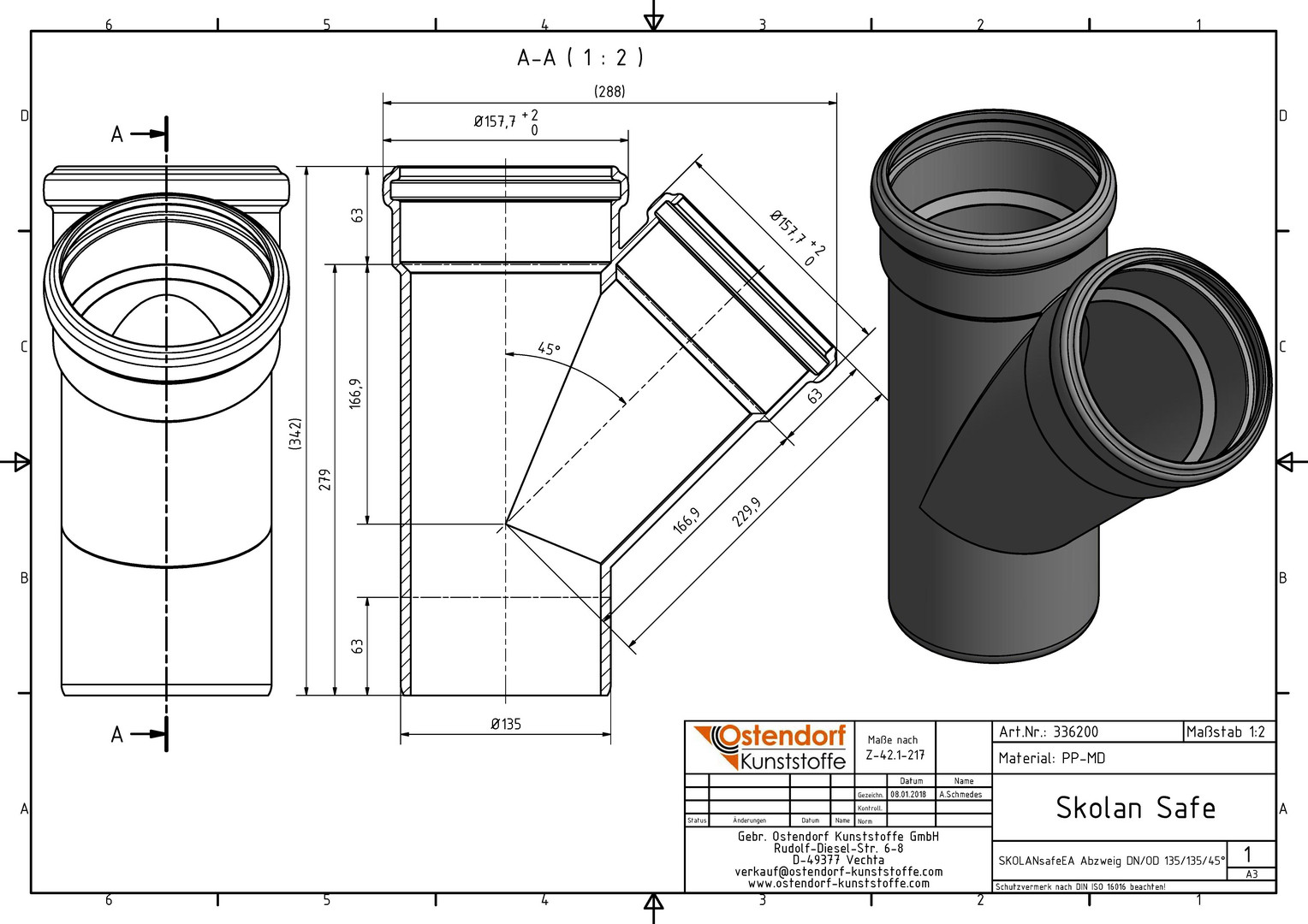 Ostendorf SKOLANsafe Abzweig EA DN/OD 135/135, 45Grad